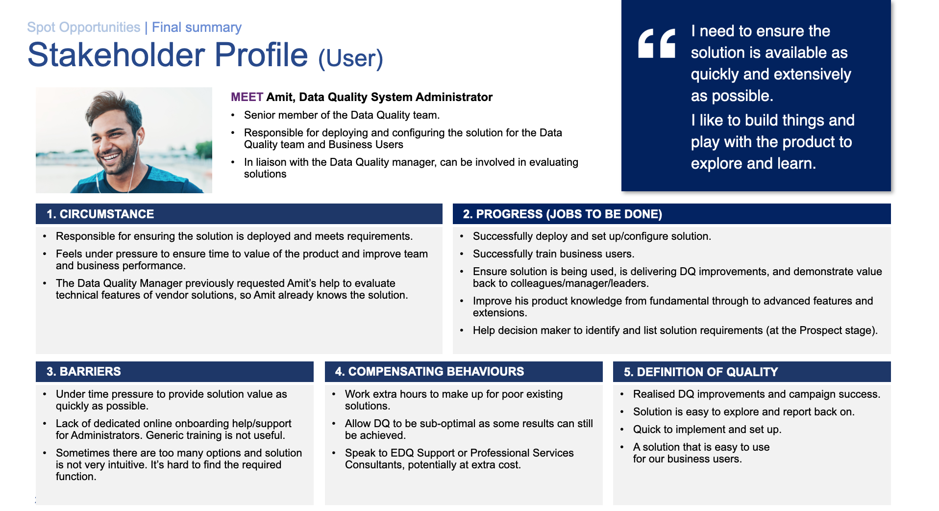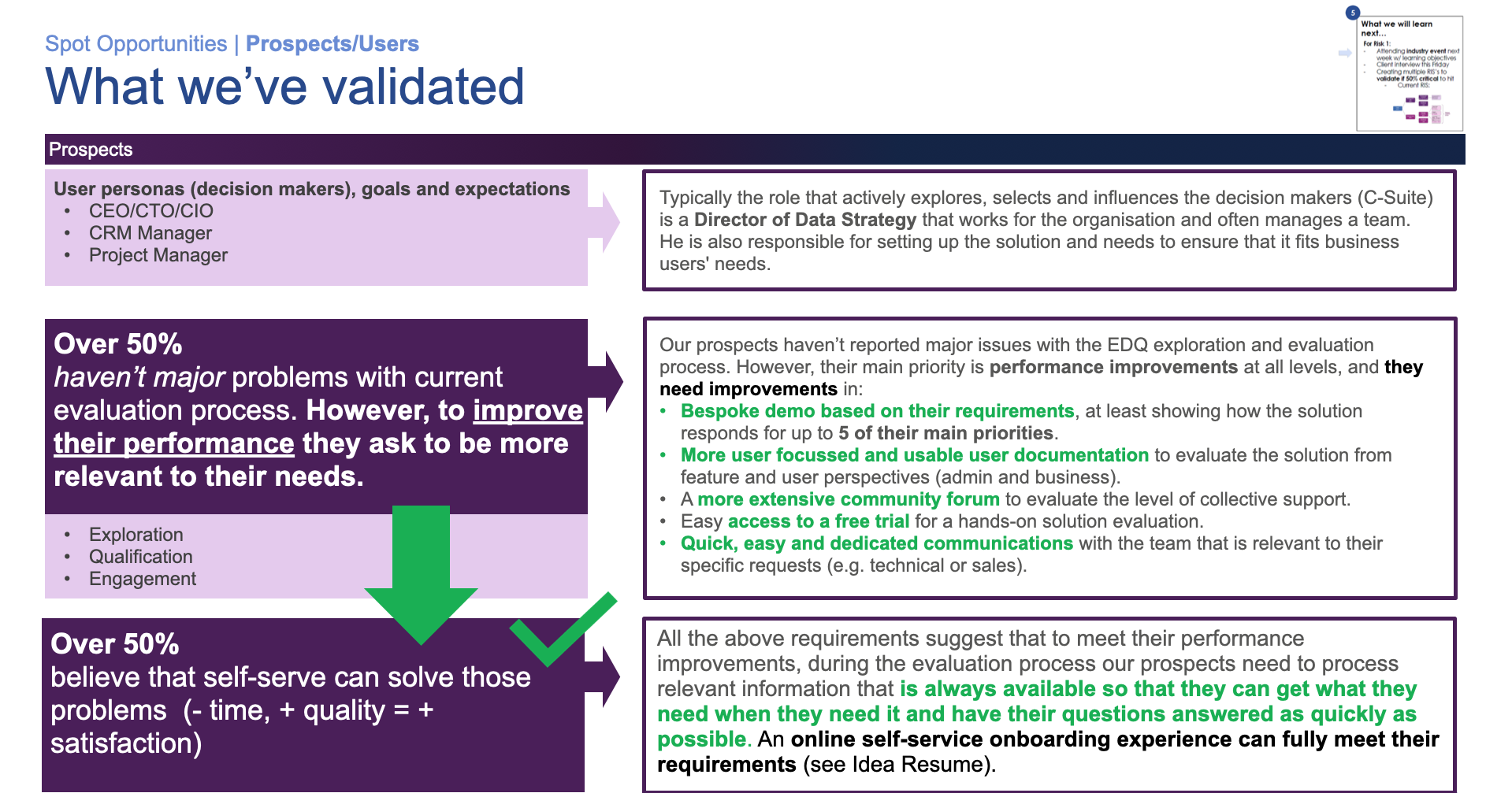 - Then by suggesting the most appropriate discovery activities I’ve been able to move away from the internal opinion-based assumptions to real users evidence-based validation.