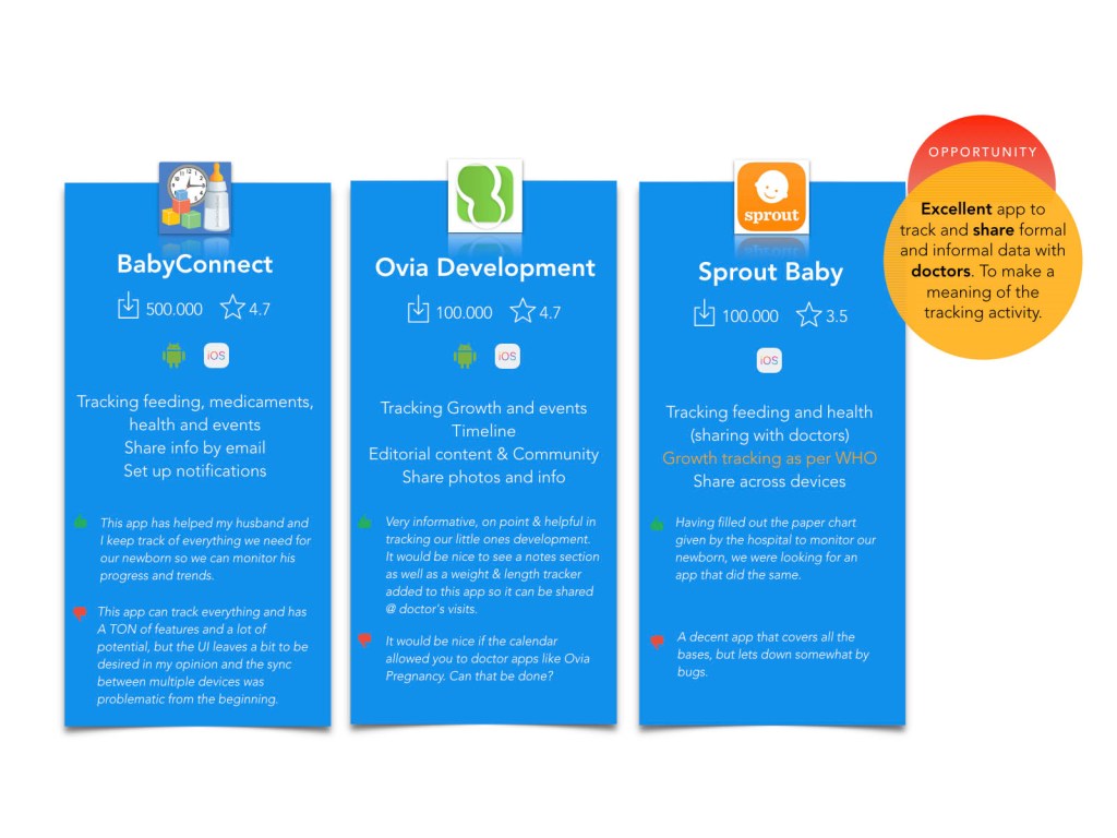 After conducting desktop research and a competitive analysis to understand the baby apps market opportunity, I analyzed users’ need and the main tasks. I created a data flow and defined the concept. Then I designed some hi-fi wireframes to show the main features and finally I suggested future improvements.