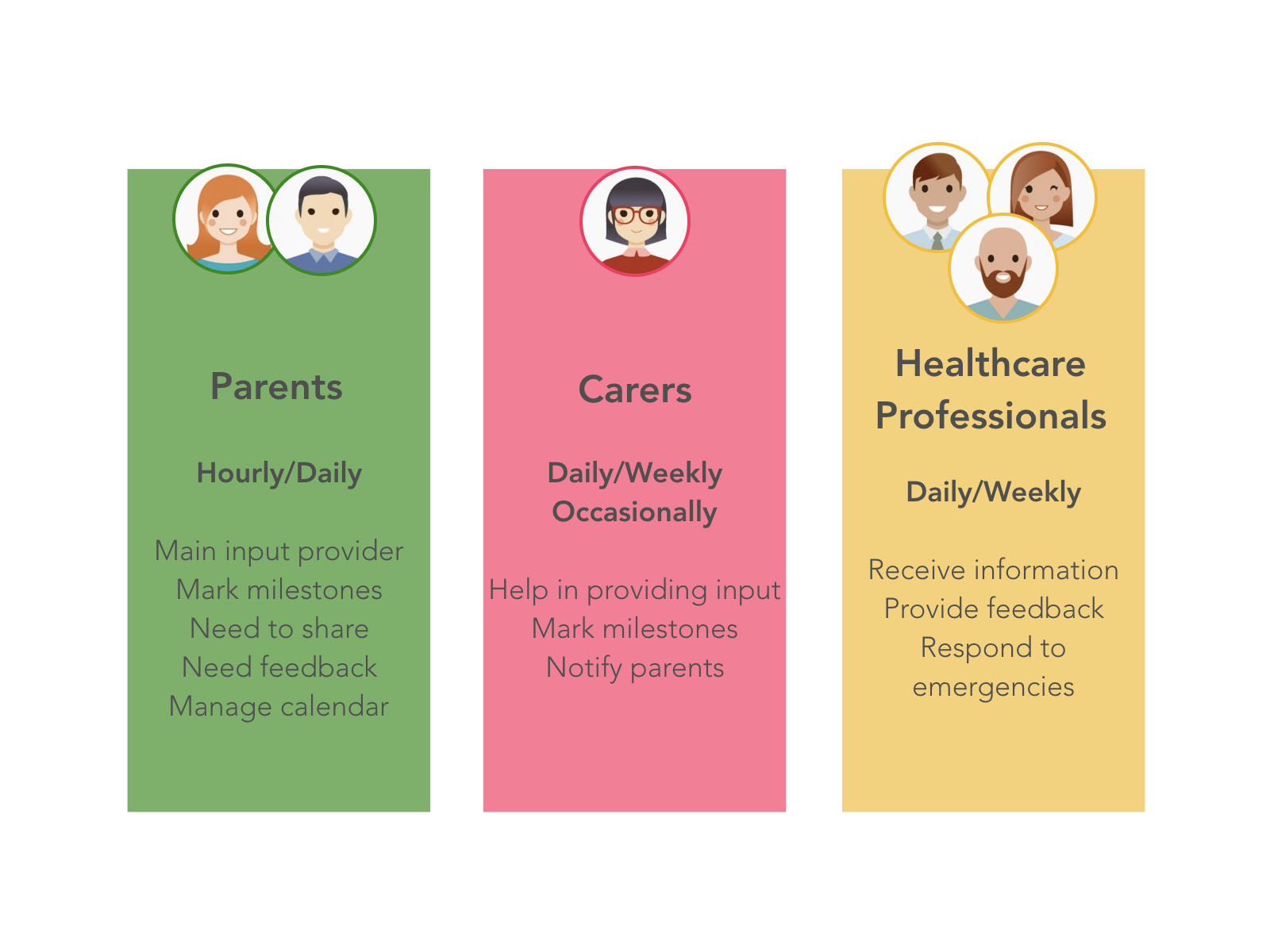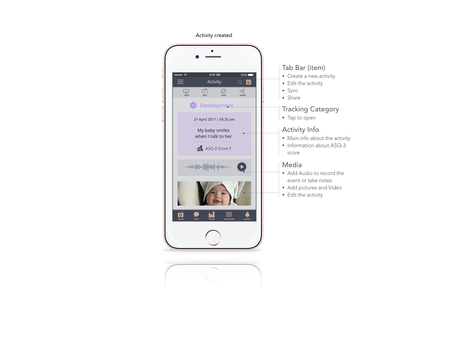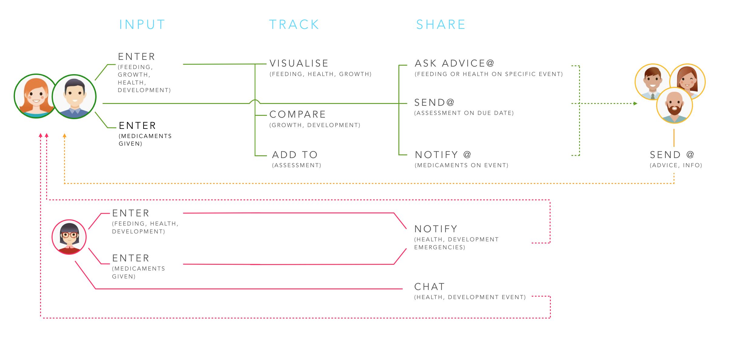 This concept enables users to track the baby’s health, growth, and development activities while comparing data with pulled in WHO and the National Health care system. They can also create formal reports to share when required. Both features match specific user requirements. Every activity can be shared with other connected users or doctors; user groups and a chat is included.