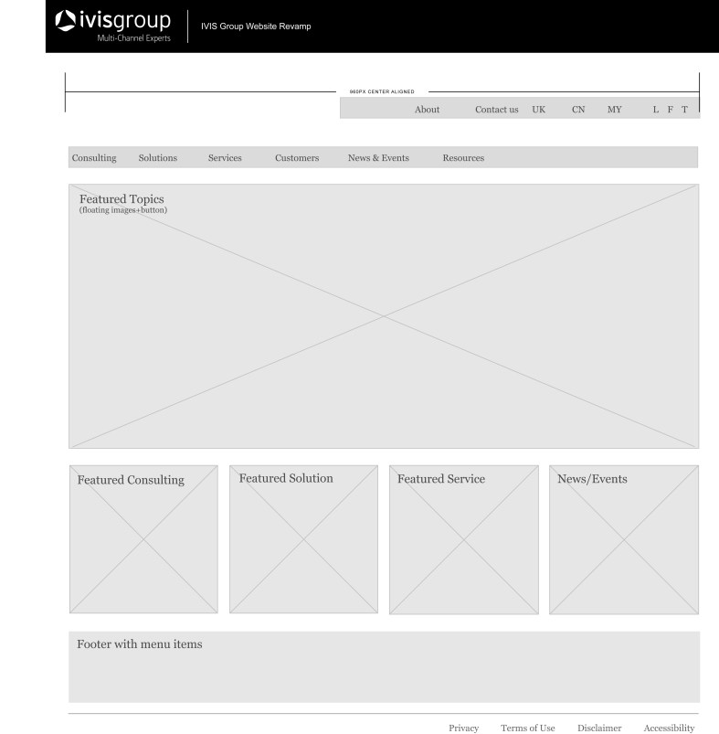I have designed the key pages on wireframes and visual mock-ups. In details, I have suggested the use of high quality images on the home page, the use of brand colours for each site section, and I have included an area for visitors to download relevant SME Reports and marketing collateral.