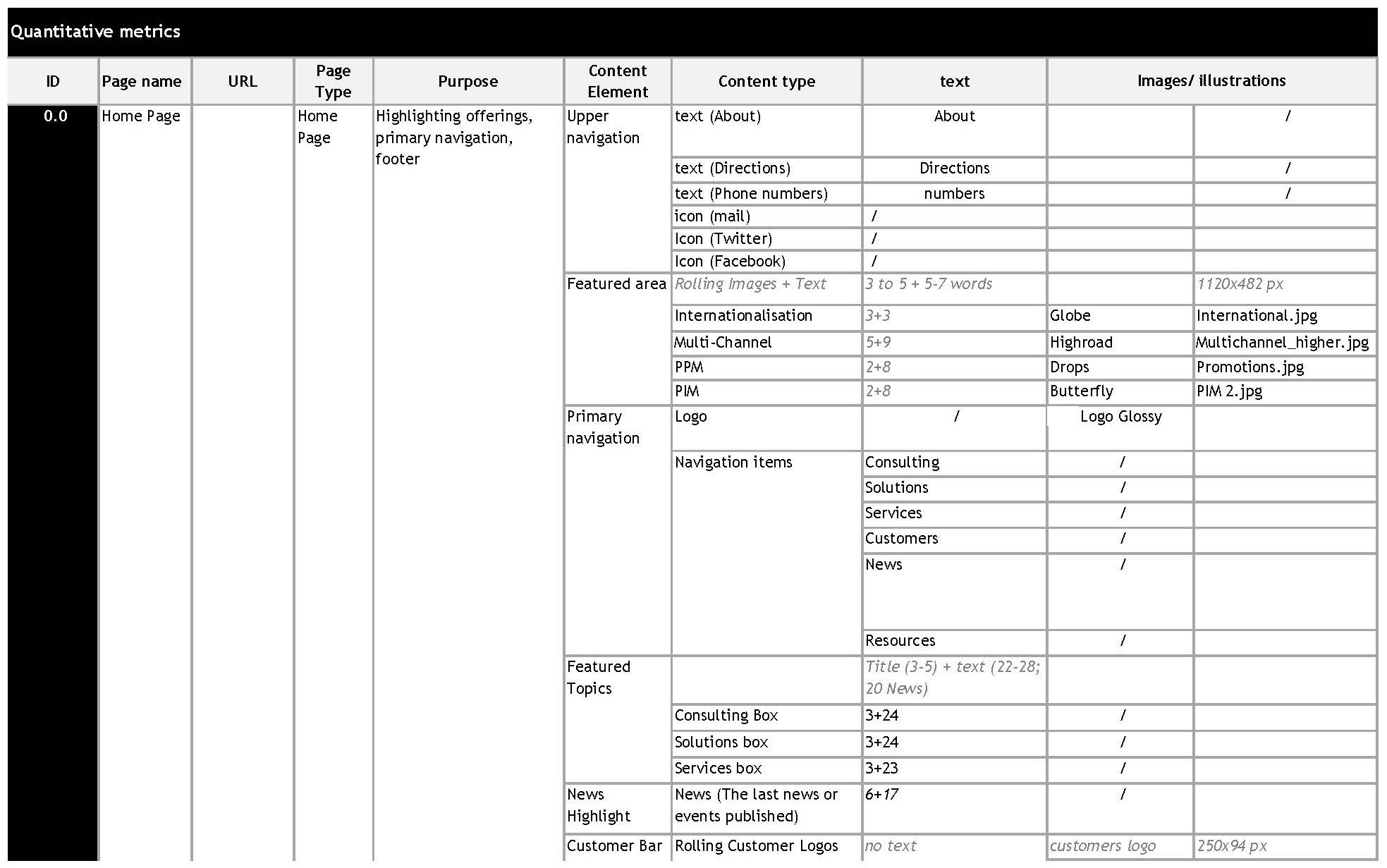 Finally, I have created a content inventory as a key tool for taking control over the content production for the new website. In liaise with the Marketing department, I have coordinated the revision of existing content and the creation of the new one. Then I have worked closely with front-end developers to translate the visual mock-ups and finally tested them before launch.